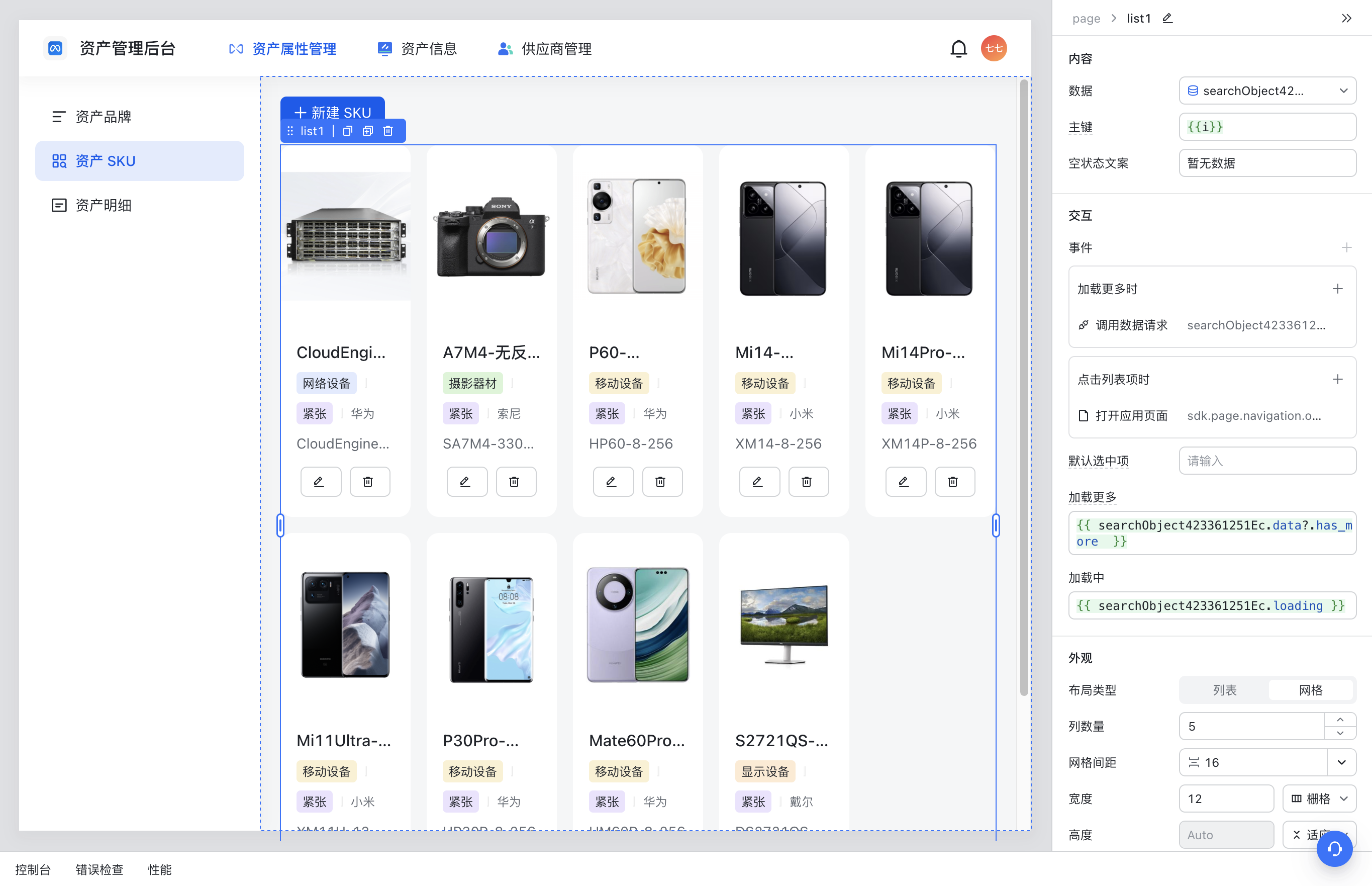 - 在资产 SKU 页面(一级页面)创建 SKU 列表,拖入一个「列表」组件,使用列表生成器导入对象数据