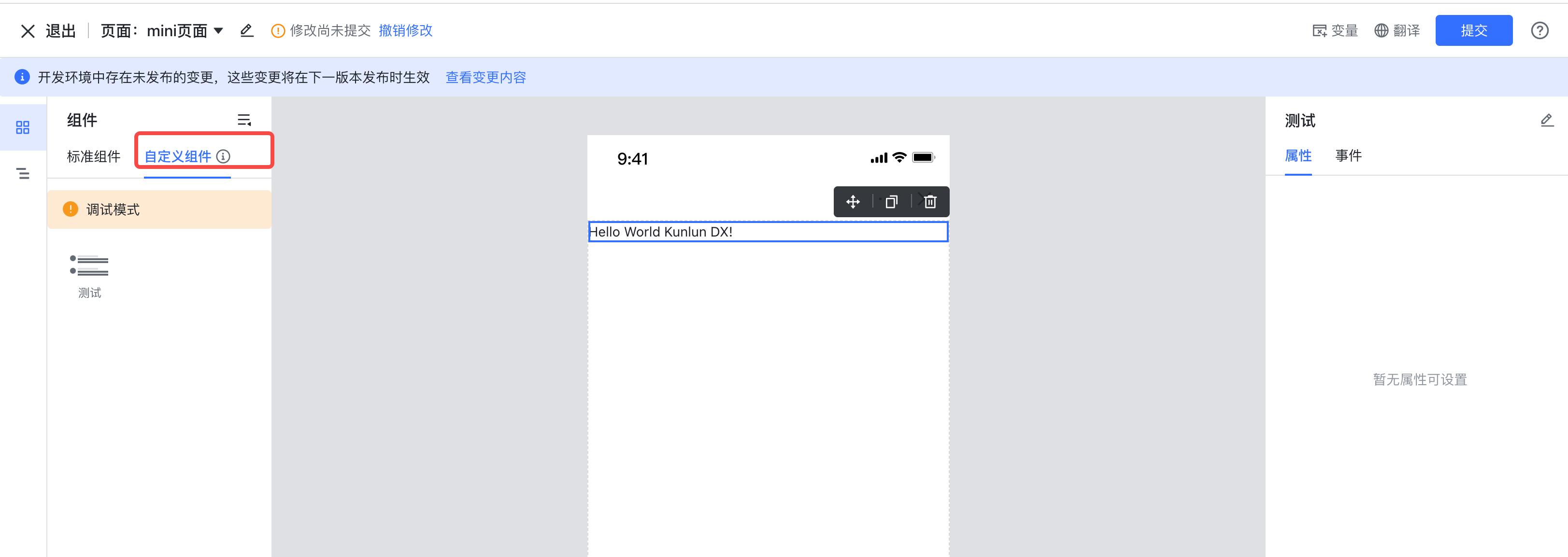 使用 kldx dev --mini-design 命令,调起调试服务,此命令单独调试移动端组件的设计态。与Web 端组件的设计态调试类似,调试服务会自动打开开发环境的浏览器窗口,并默认跳转到【应用列表页】。点击进入到【页面编辑页】,在【自定义组件】分组,即可查看本地调试的自定义组件。