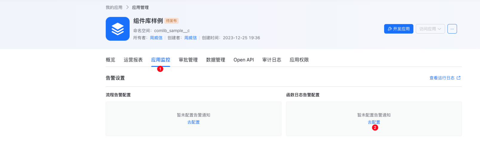 - 进入应用管理页,点击「①应用监控」->「②函数日志告警配置.去配置」->「③填写记下 Webhook 地址」。