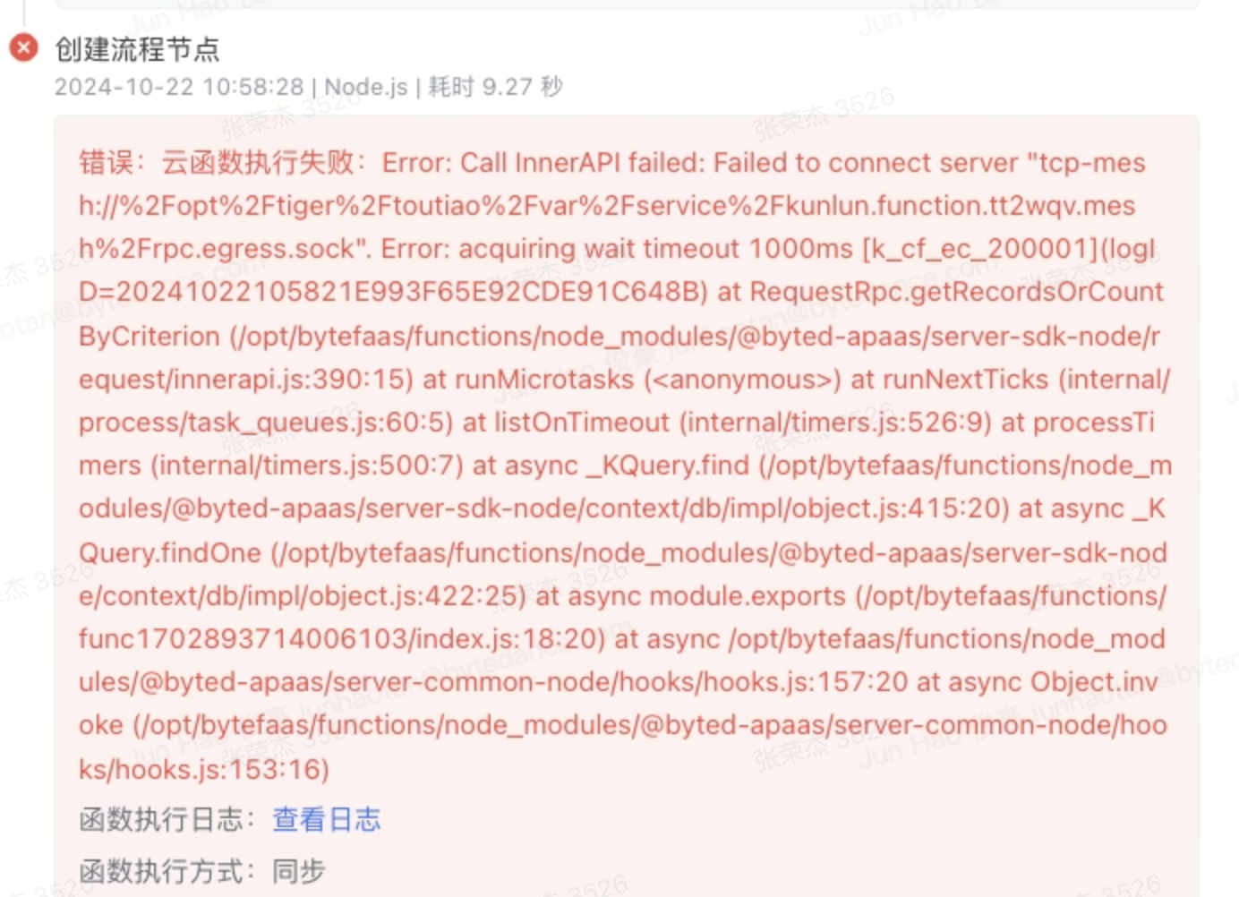 然后部署、发布到线上环境后,流程调用函数或者直接运行函数时报错: