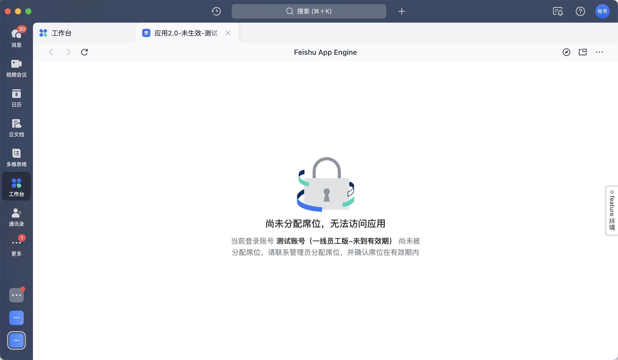 - 席位分配更新后,到飞书低代码平台生效可能有最多 1 分钟的延迟,更新席位后,如未生效可以刷新页面。