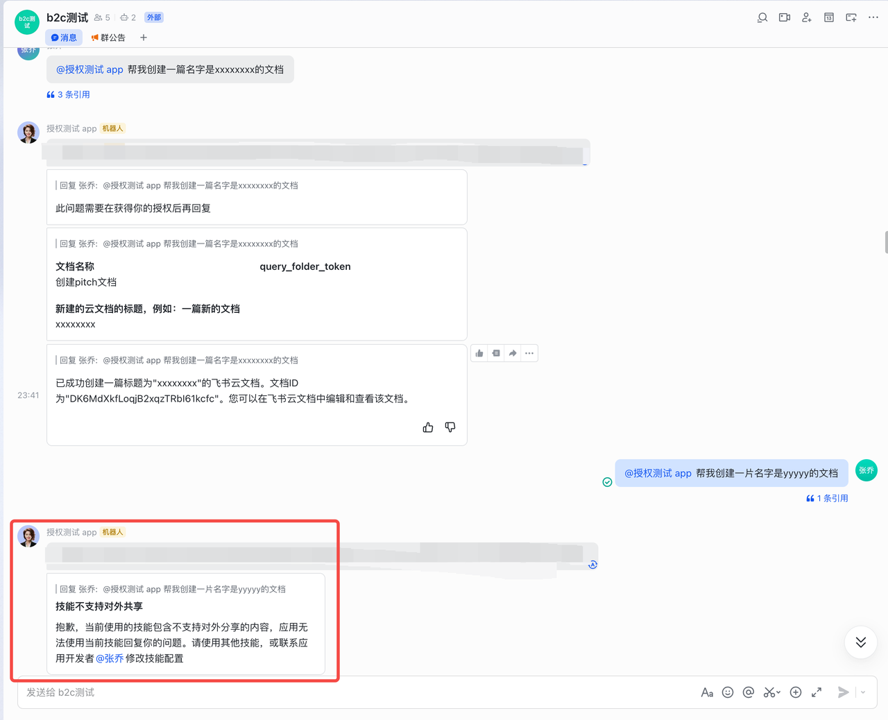 本期仅支持部分技能允许外部用户使用,包括知识问答、数据表等能力,飞书OpenAPI能力受限使用