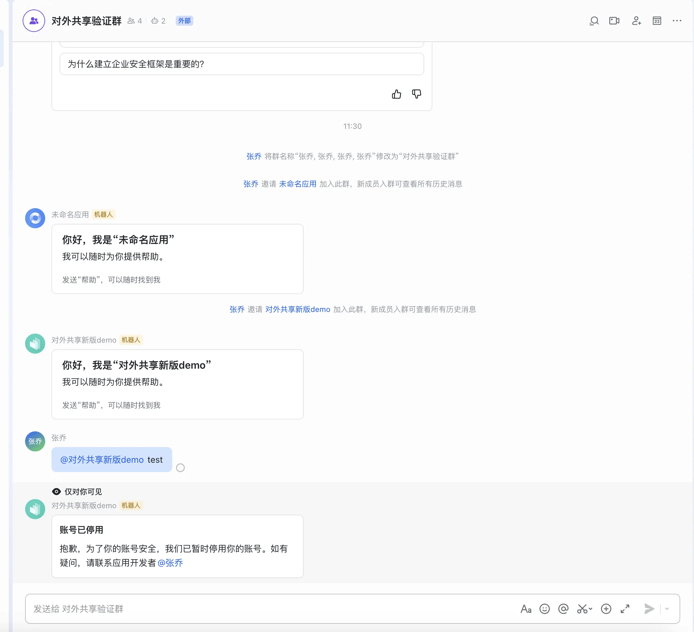 外部用户加入外部群后,可以直接与允许对外共享的应用对话,应用回复方式取决于机器人回复设置。用户也可以通过开启对话单聊对外共享的应用。