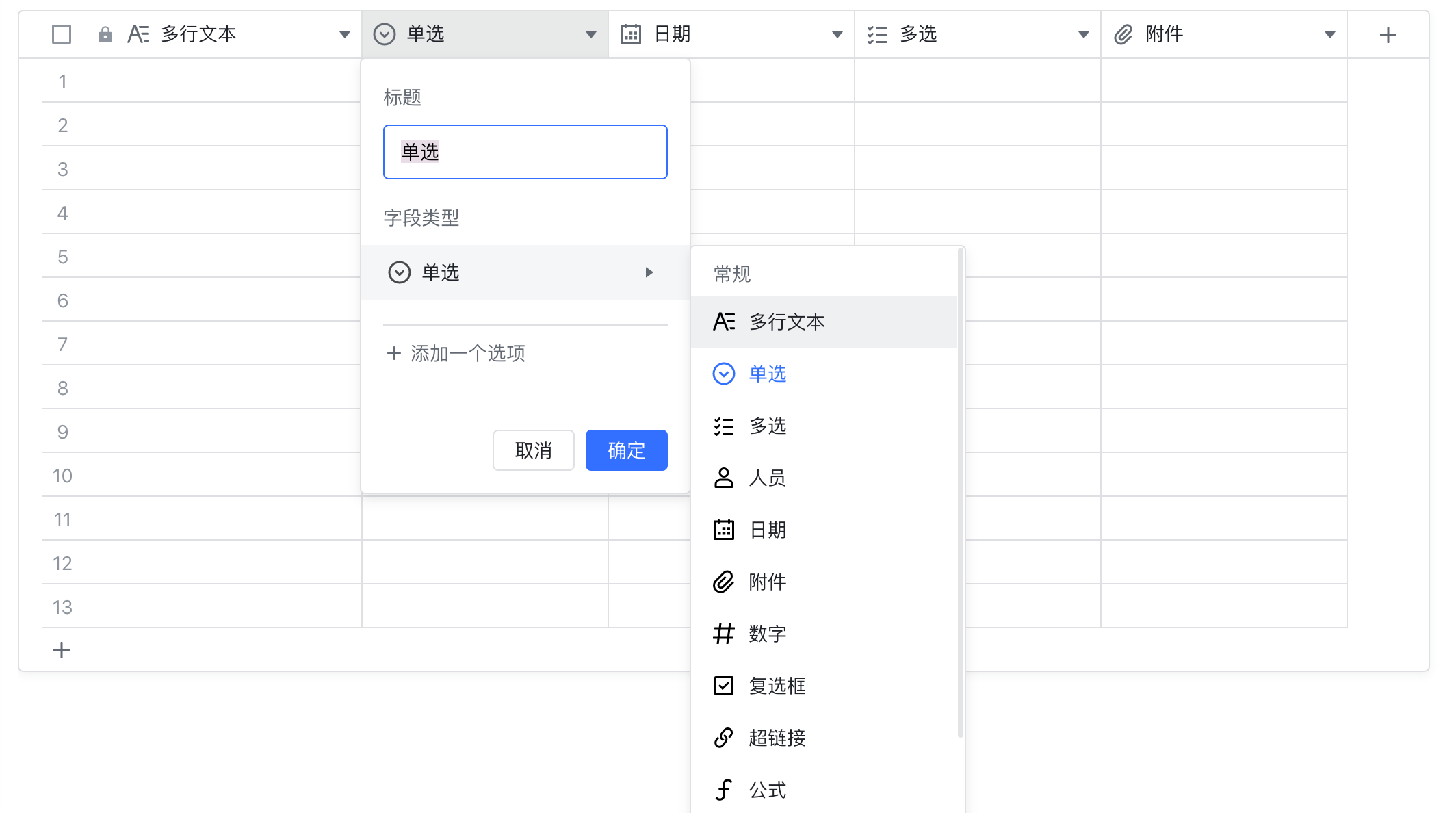 - 你可根据项目需求,选择添加不同的字段类型,以将每列的数据类型定为:多行文本、单选、多选、人员、日期、附件、数字、复选框、公式、关联等。