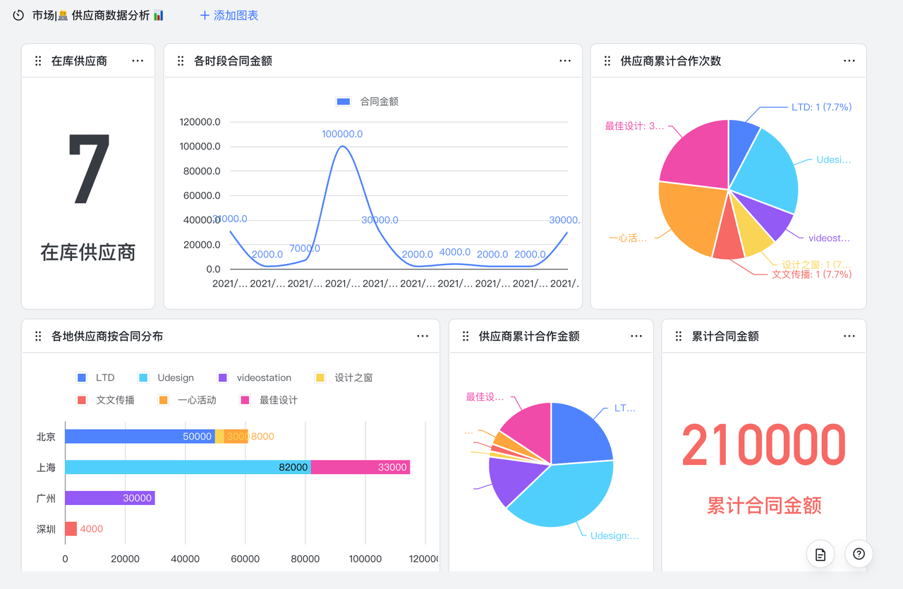 供应商管理 :整合供应商信息、合作订单记录,通过仪表盘分析累计合作金额、地域分布等。