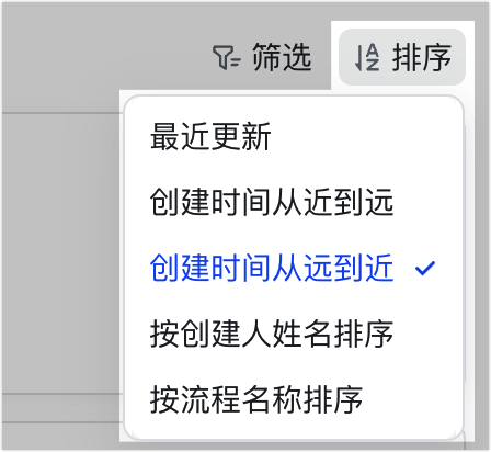 - 对自动化流程进行排序:支持根据“最近更新”、创建时间、创建人姓名、流程名称进行排序。