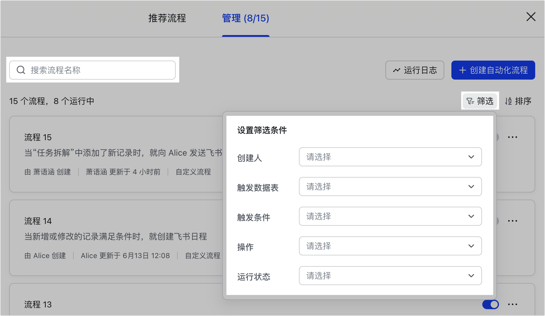 当自动化流程过多时,你可以从流程名、运行结果、流程编辑者等多个维度对自动化流程进行筛选,快速定位到你希望查看日志的流程。