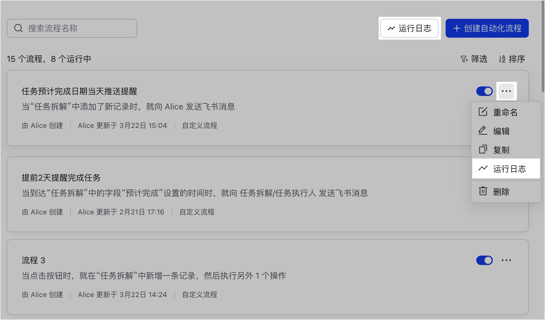 点击各流程右侧的 ··· > 运行日志,也可以查看对应流程的运行情况。