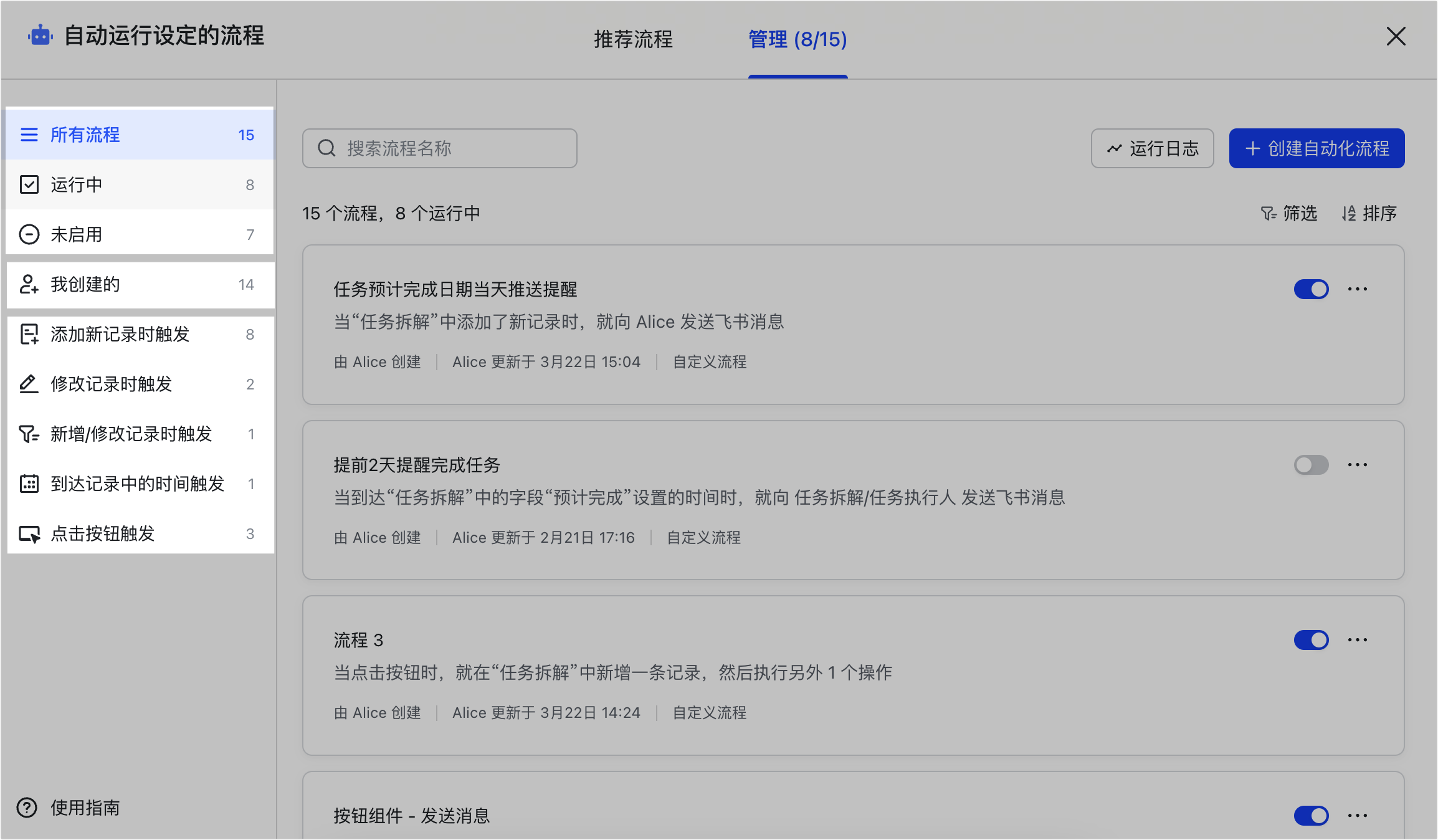 在面板左侧,所有的自动化流程会按照启用状态(“运行中”或“未启用”)和触发条件进行分类。同时,如果所有流程中有你创建的自动化流程,那么还会展示“我创建的”这一筛选条件。