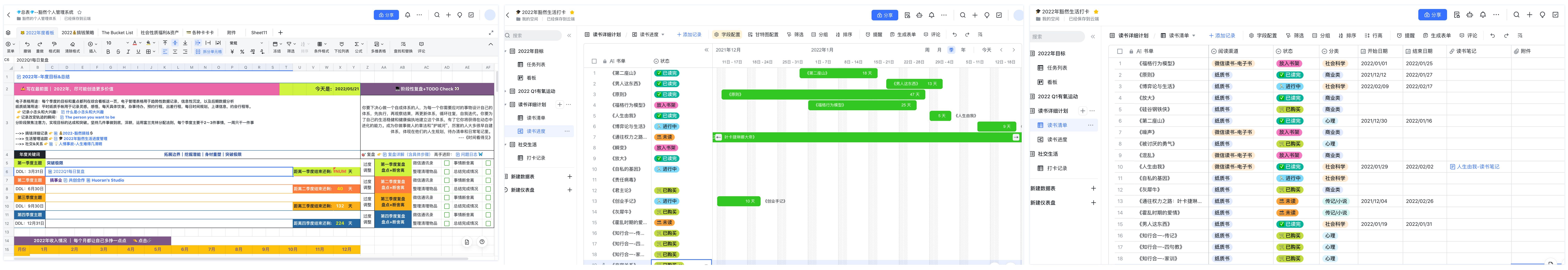 可以用飞书搭建高颜值的生活管理模板、包含生活里的各个维度,比如全年的目标管理,读书进度,生活管理等等手帐。