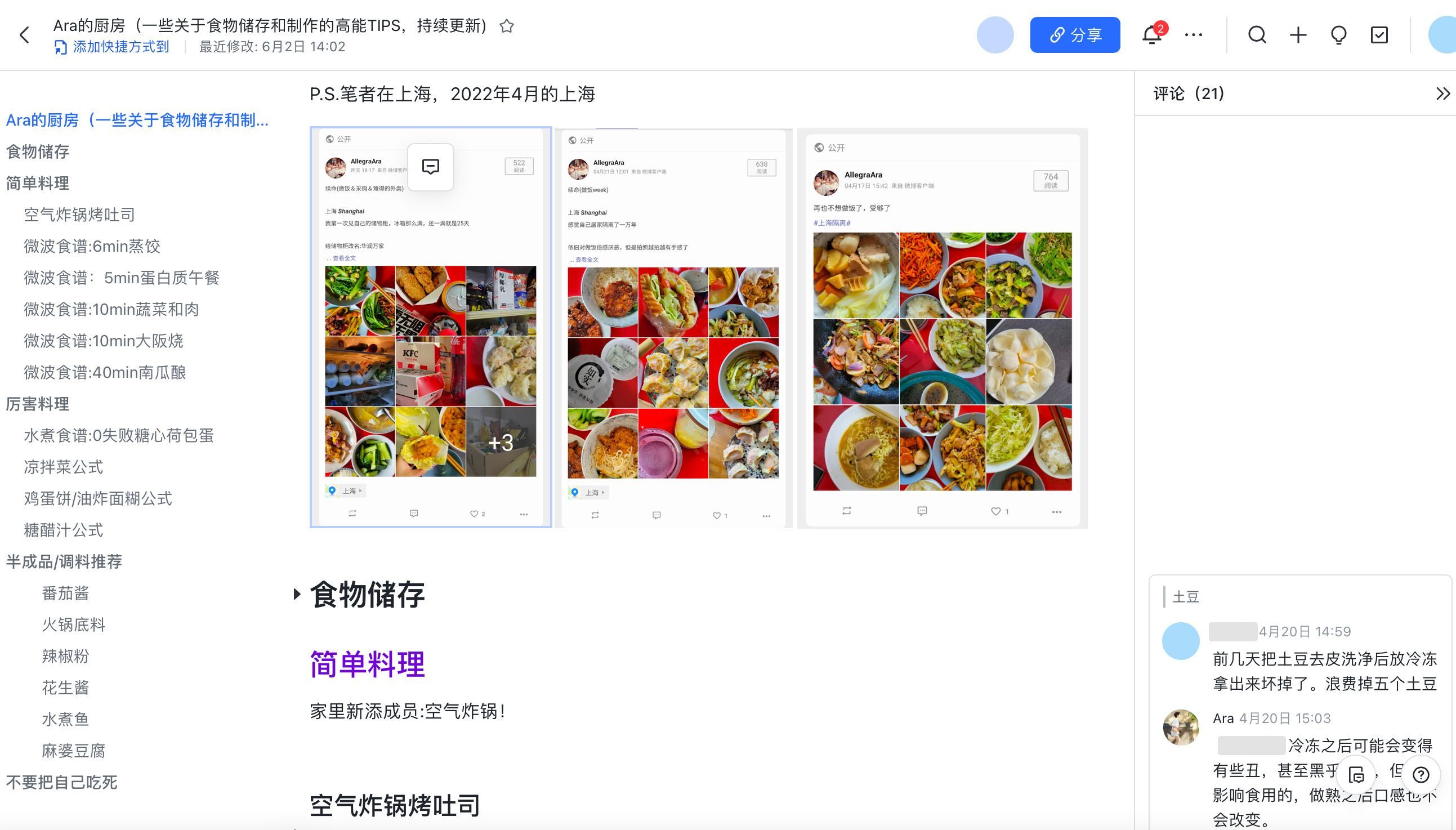 既可以用飞书文档和朋友们交流厨房菜谱,分享自己的拿手菜做法到文档中,还可以配上菜谱和照片,用评论功能互相讨论如何改进。