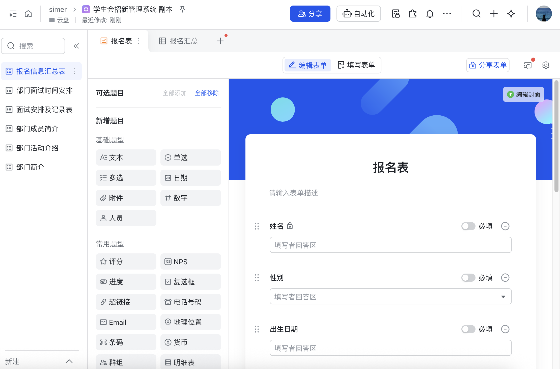 - 策划与执行:从社团招新到迎新晚会再到到校园歌手大赛,使用多维表格发布问卷,直接收集活动报名信息,自动同步到表格;利用多维表格新建活动管理表,利用看板视图划分活动阶段,设定任务描述、负责人、截止时间等,任务自动流转