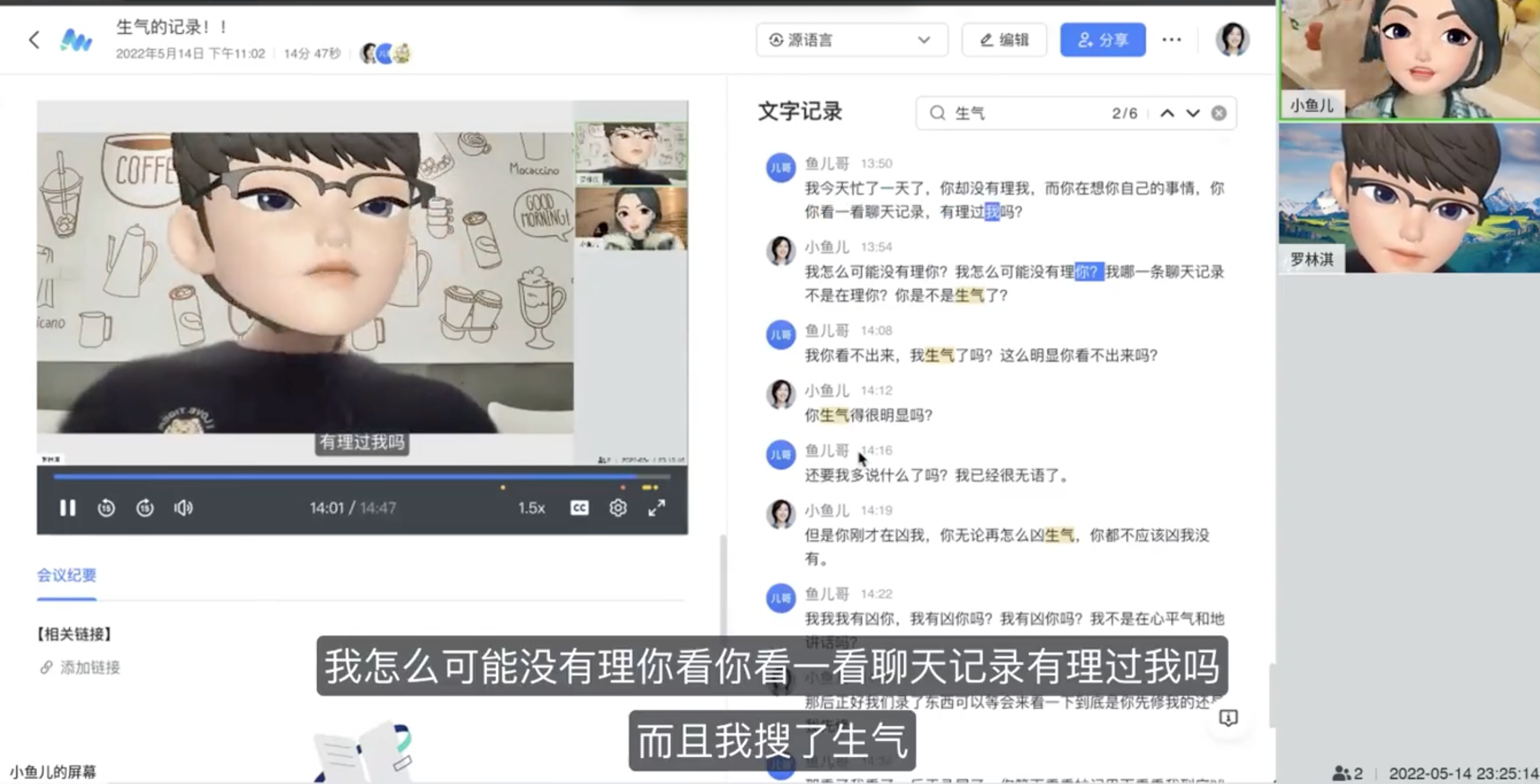 - 相比普通的语音电话,用飞书视频会议和恋人沟通,可以通过妙记为每次的视频留存美好回忆。甚至是吵架的事实记录,复盘的一手证据!做到吵前有沟通,吵中有记录,吵后有复盘。再也不会担心对象说“我哪有凶你”!