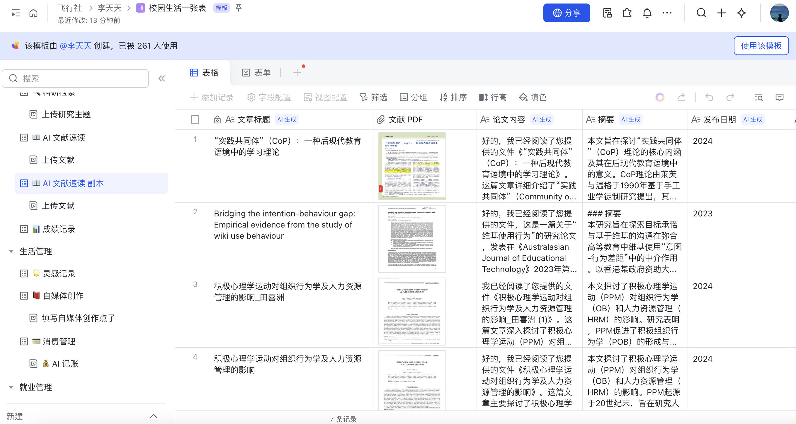 - AI赋能:利用多维表格的AI插件,输入研究课题,让AI自动搜索相关领域的最新论文摘要,并汇总到表格中。
