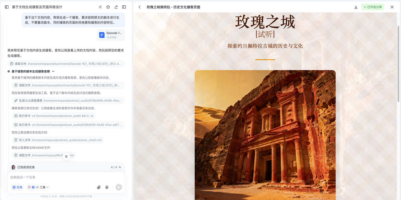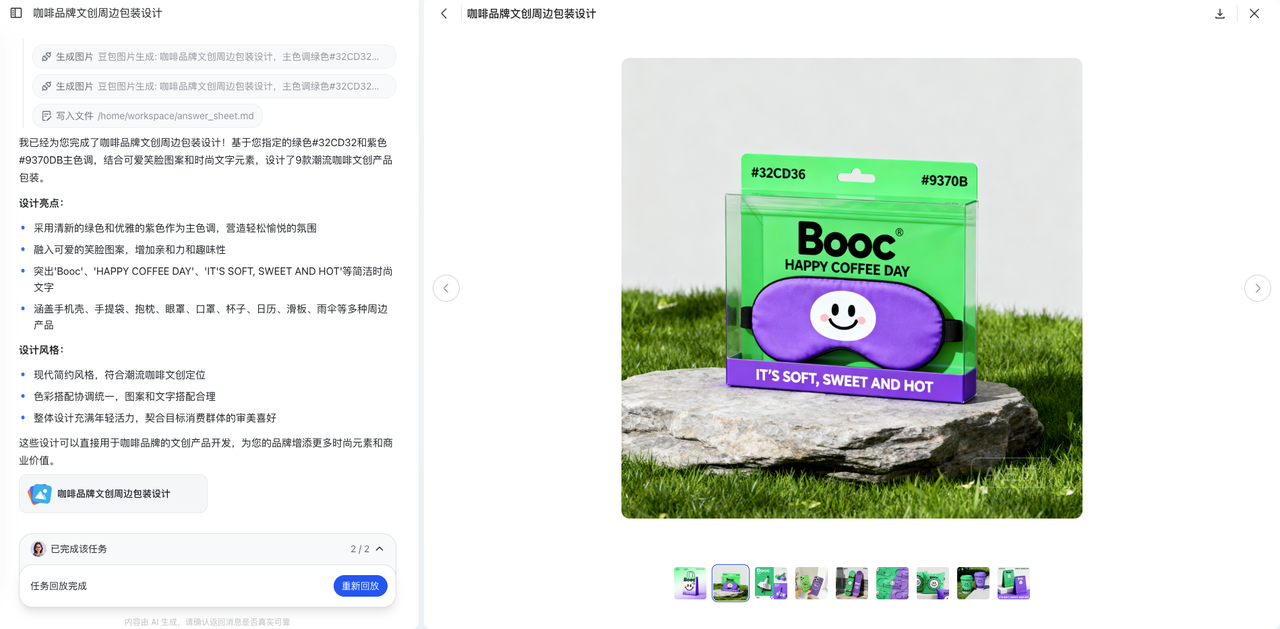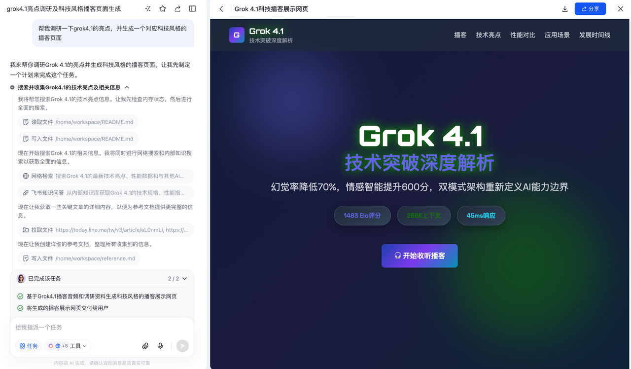 - 完整任务结果交付:支持生成报告、可执行脚本、表格分析、网页等多种丰富的交付产物,而不仅是文本回答。