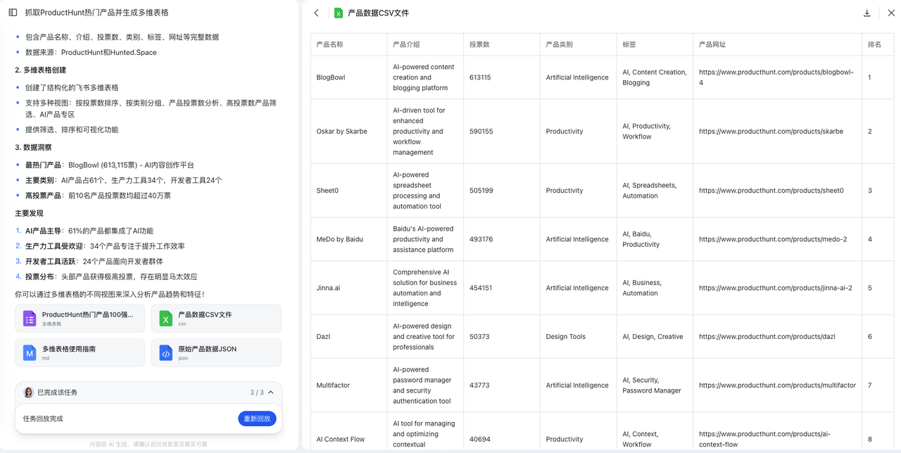 - 更丰富的产物:除云文档、报告外,将会支持多维表格、网页、播客等多种内容丰富的产物;