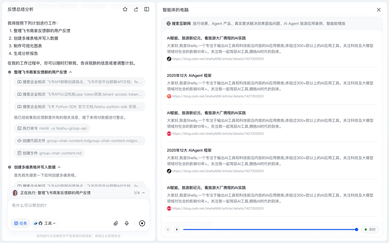 - 虚拟电脑运行环境:云端电脑/沙箱提供浏览器、终端、文件系统与网络访问等能力,承接多步执行与产物落盘,还可以通过编写代码,调用接口完成更多长尾需求;