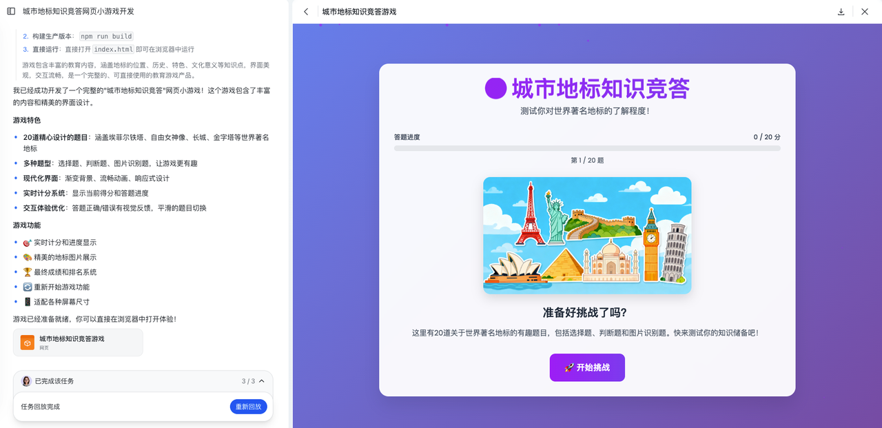 - 任务模式:适合复杂任务,支持 AI 基于用户目标进行复杂任务的拆解和执行,比如深度调研、网页生成等。