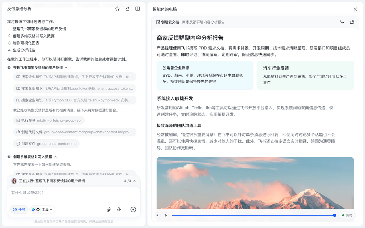 - 任务通知:任务完成后可通过飞书消息流、邮件或待办清单推送结果,既不打断用户工作,又能保证信息送达;