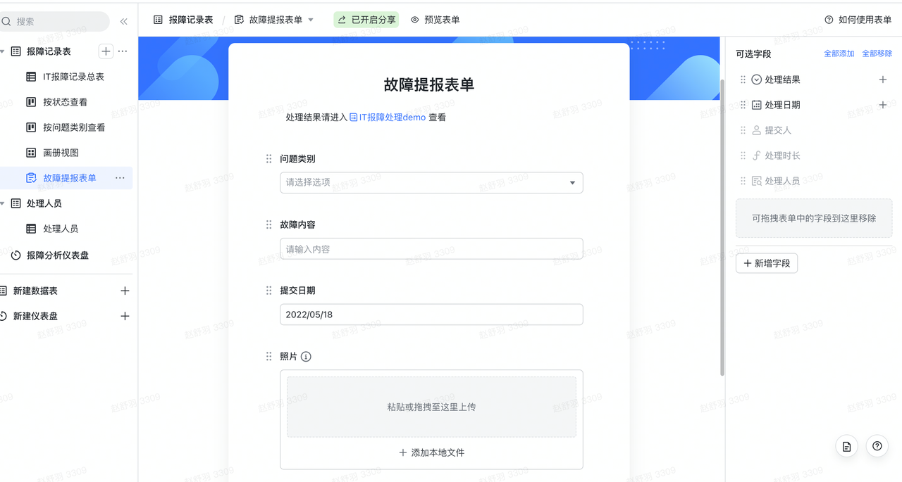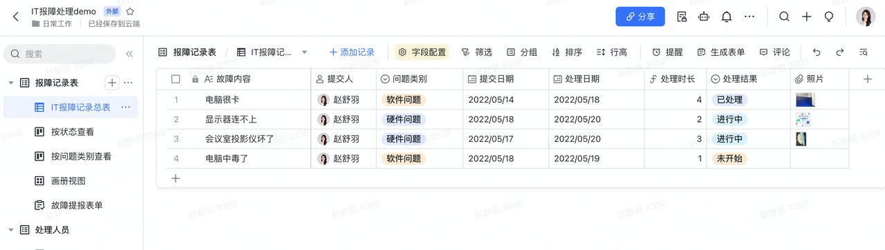 看了多维表格搭建工单管理系统案例,却又担心搭建系统太难?其实不需要是IT专家,也可以搭建出类似的系统。以下以一个“IT报错系统”为例,让我们使用多维表格,搭建一个轻量报障系统,进行工单的提交、跟进与反馈