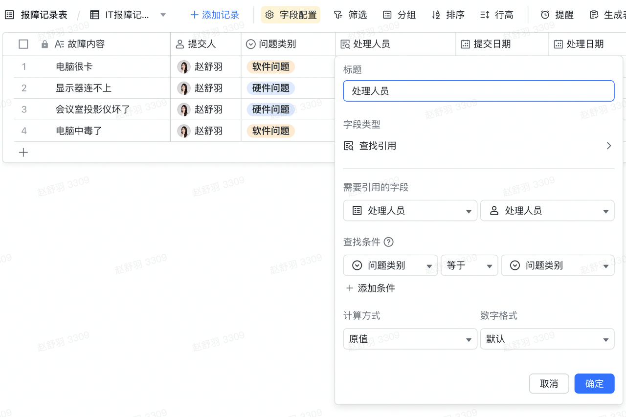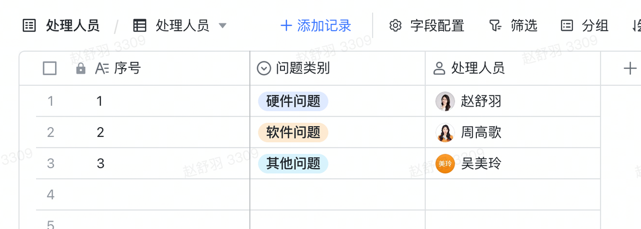 需要一个表格来记录不同问题的对应处理人,并且与报障进行自动匹配