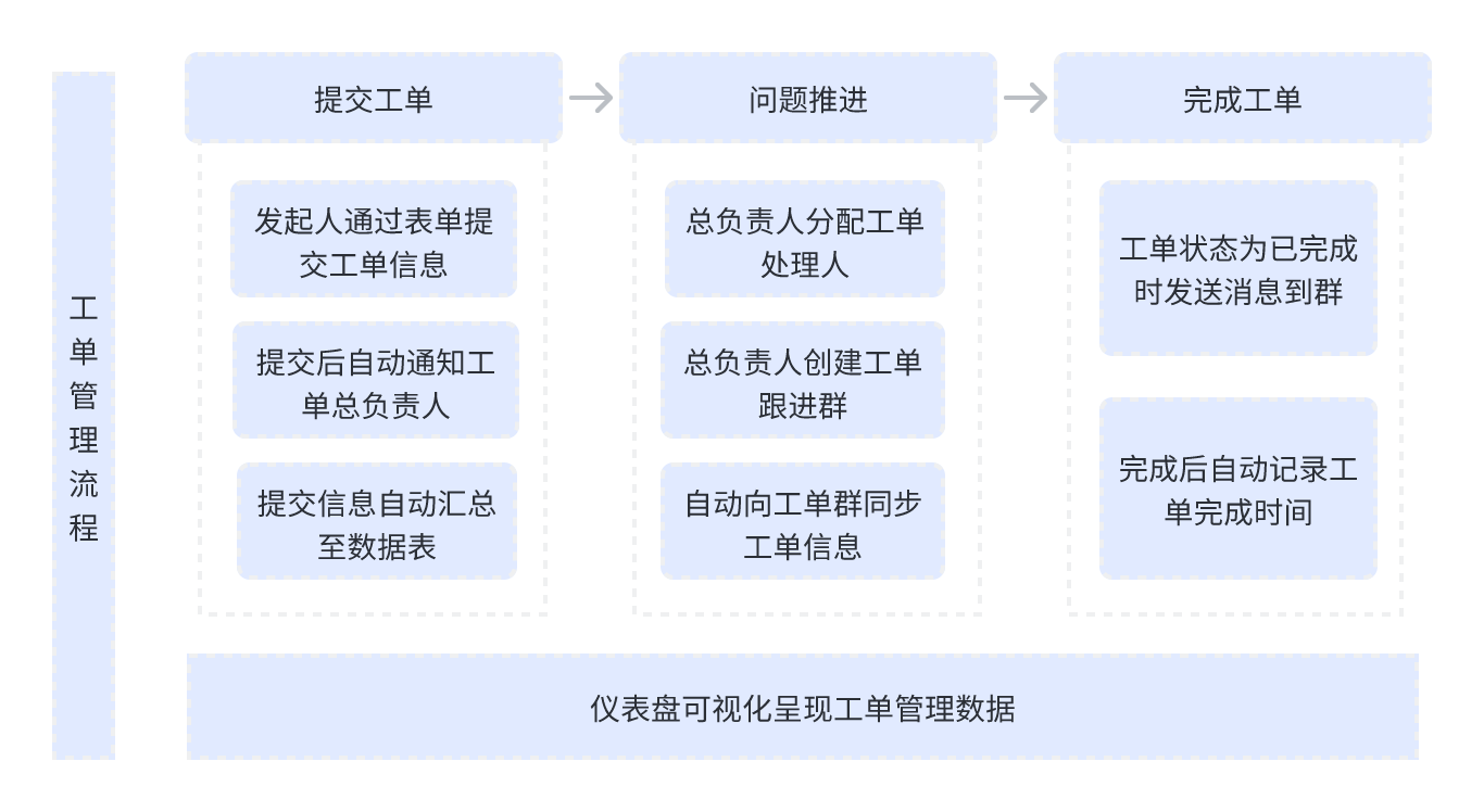 现在,基于飞书多维表格灵活、高效的功能,在工单场景中我们可以实现 工单提交 > 推进 > 解决归档 这一流程的有序化和规范化: