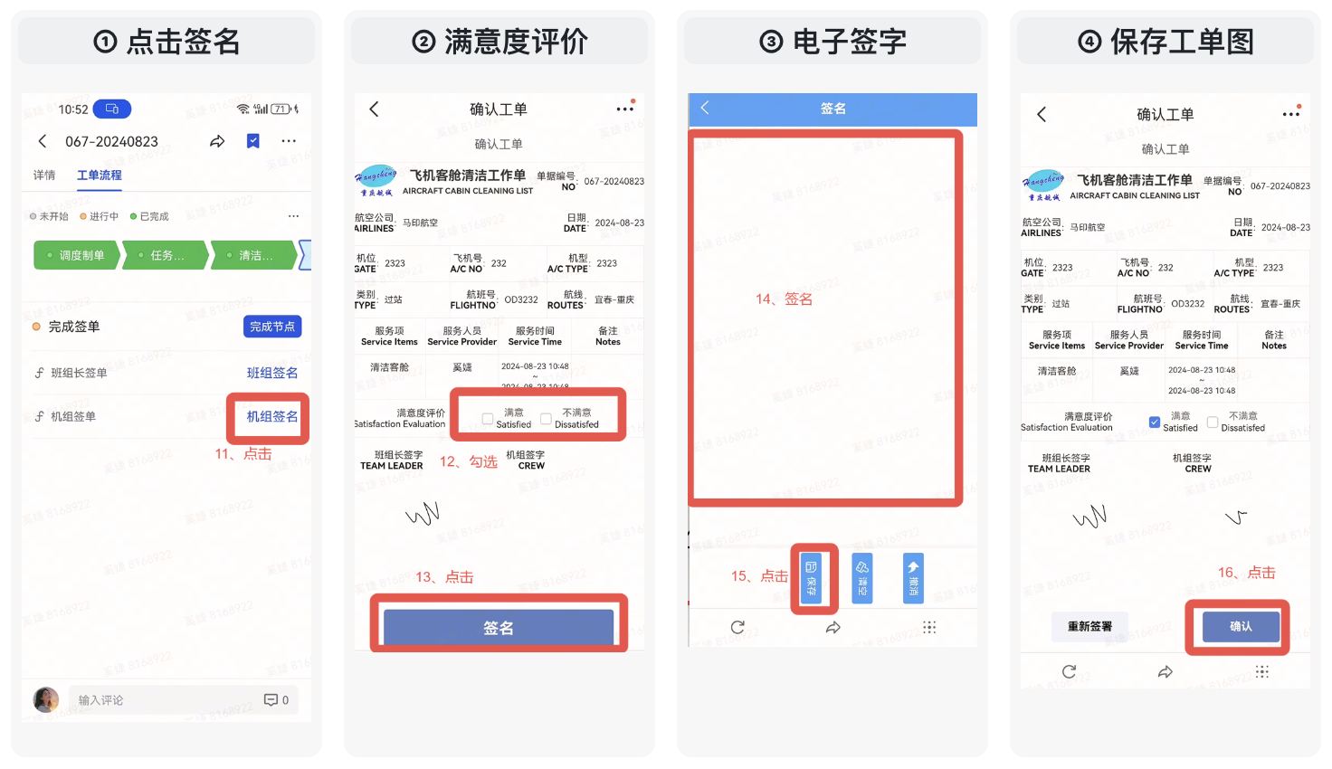 一线清洁人员从开始的 接收工单、确认上机、确认下机、工单签字 全流程实现线上化,并且无需学习复杂的系统操作,在一个消息框中完成工单闭环。