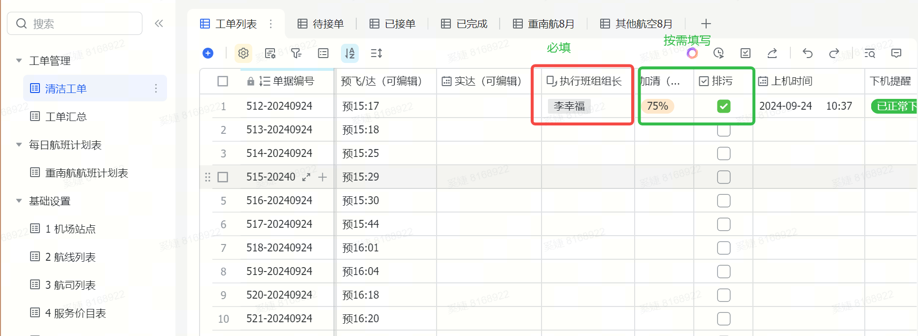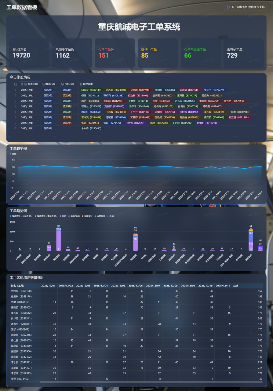 调度人员作为客舱清洁服务的 "指挥中心",其工作效率直接影响整体服务质量。通过多维表格,从 调度制单便利性、任务分派灵活性、工单进度清晰性 三方面提升调度人员管理效率,替代原有的对讲机呼叫及微信群联络的传统模式。高峰期(如早班机集中时段)可同时处理10+工单,分派效率提升200%。