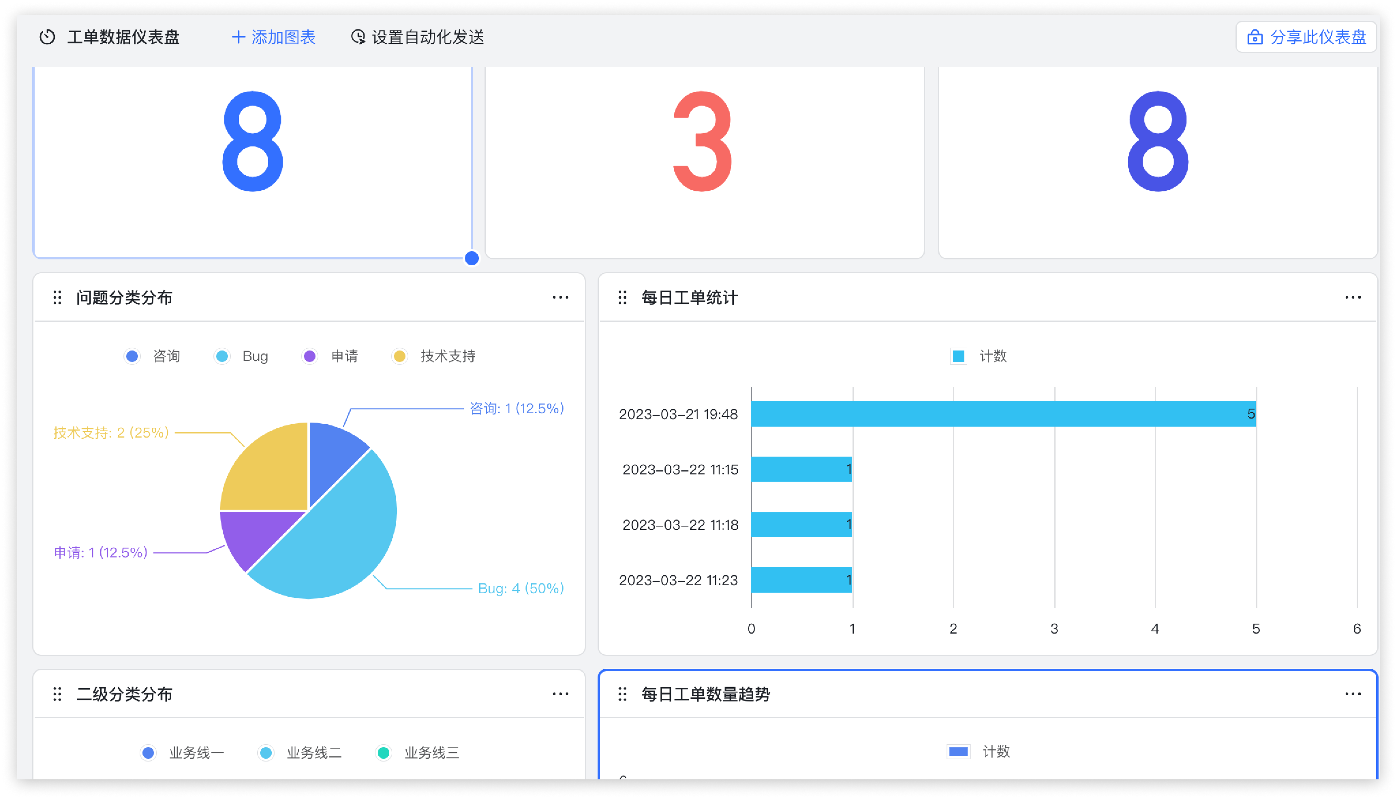 - 添加一个“统计数字”图表,统计工单总数