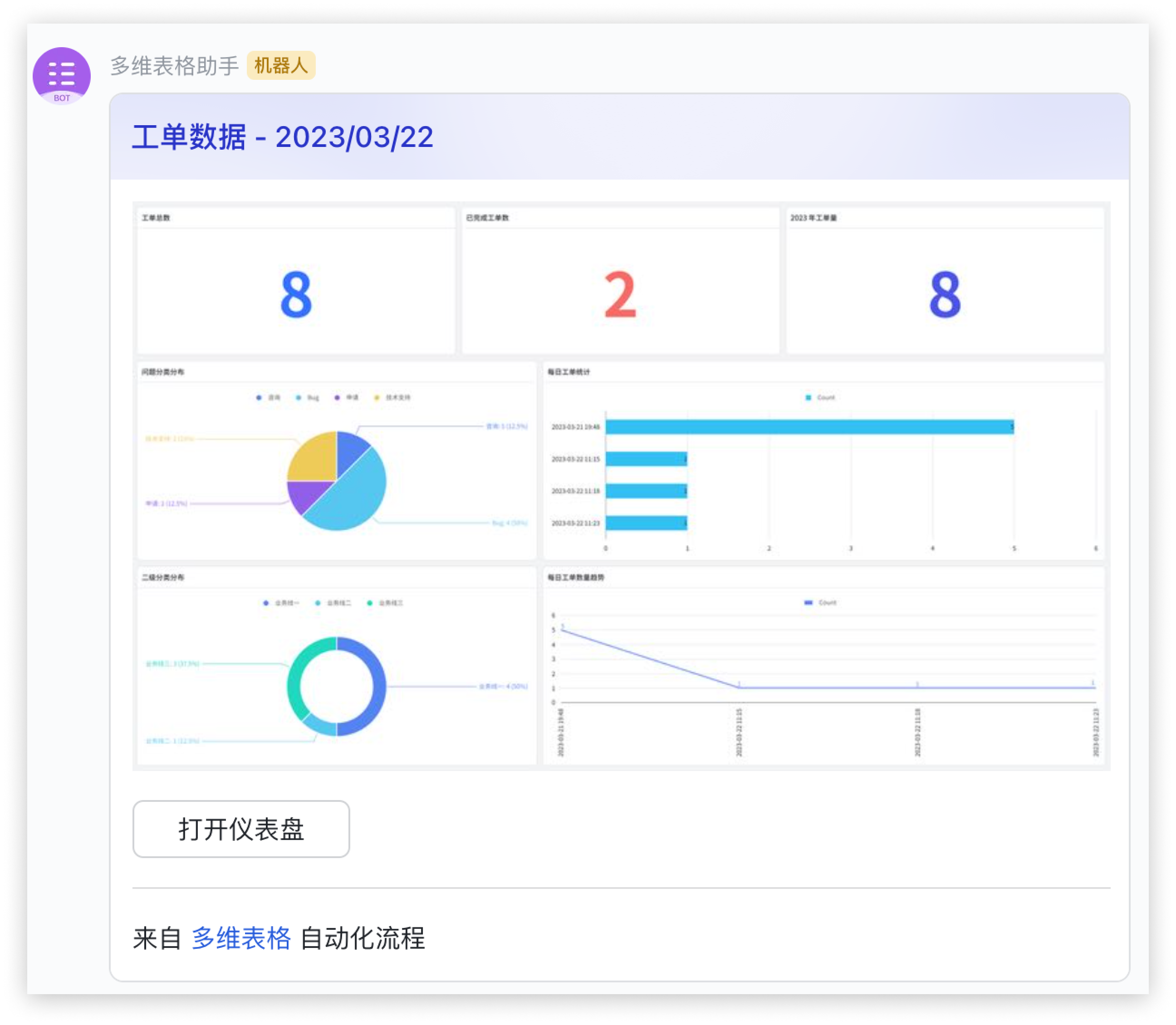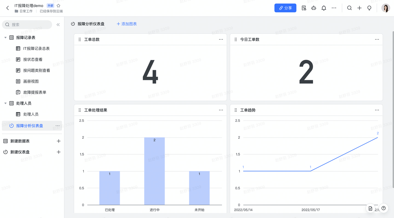 通过仪表盘进行工单数量、处理进度的分析