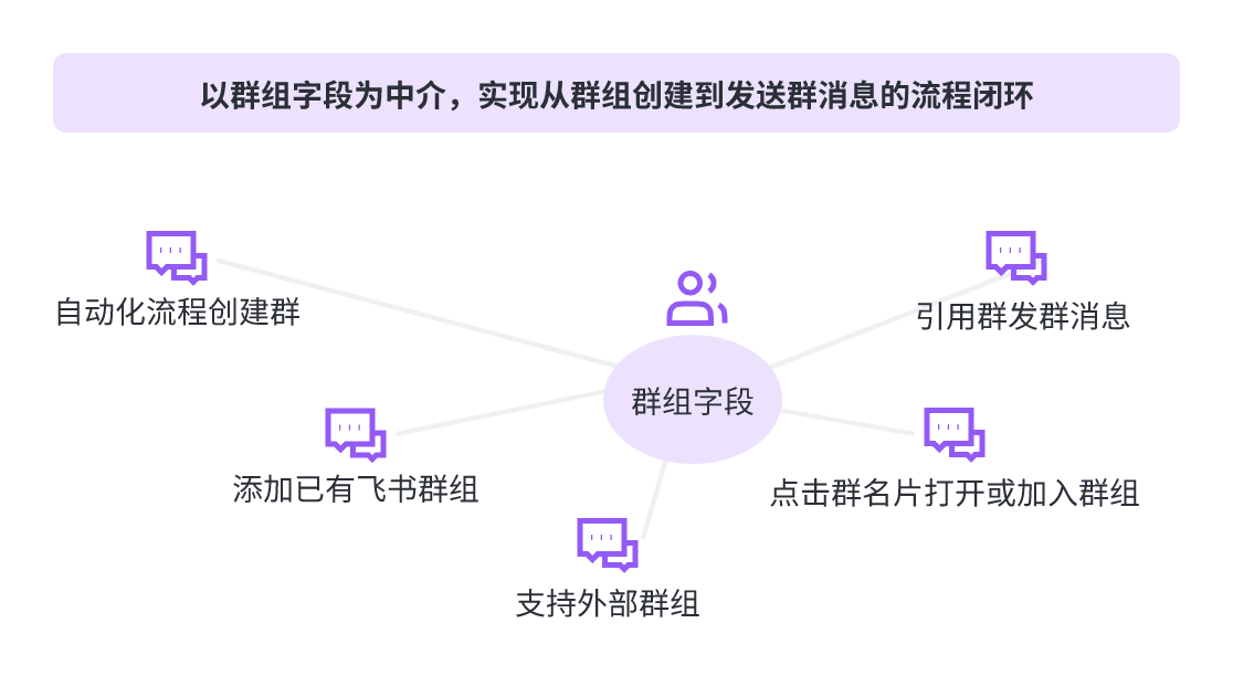 这是飞书最独特的功能之一。通过自动化流程与分组字段的结合,高效的实现了“一行数据对应一个群”的协作: