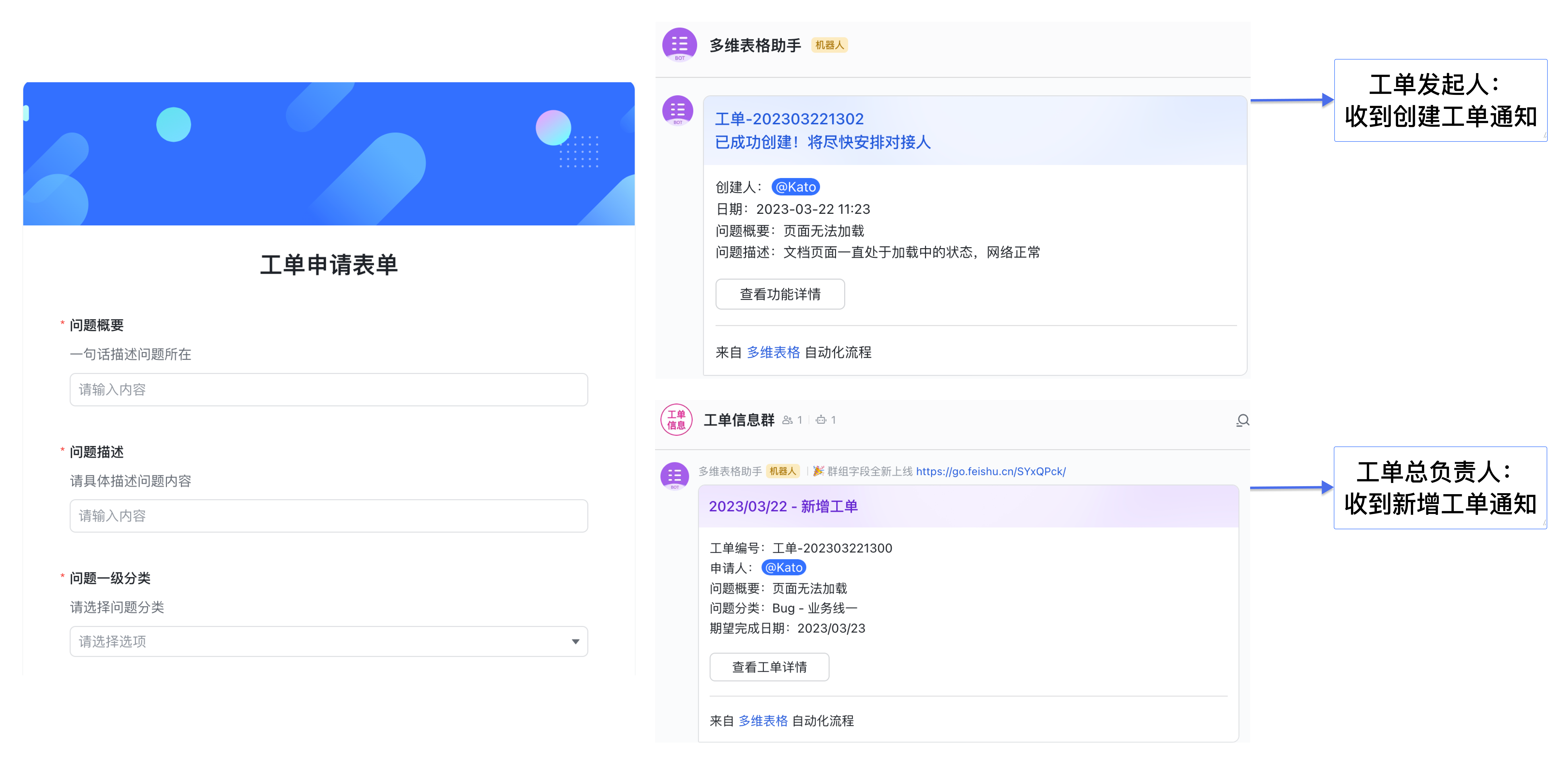- 自动建群协作:负责人判断需要协作时,系统自动创建飞书群组,将发起人、处理人拉入群中,并自动把工单详情发送到群里。