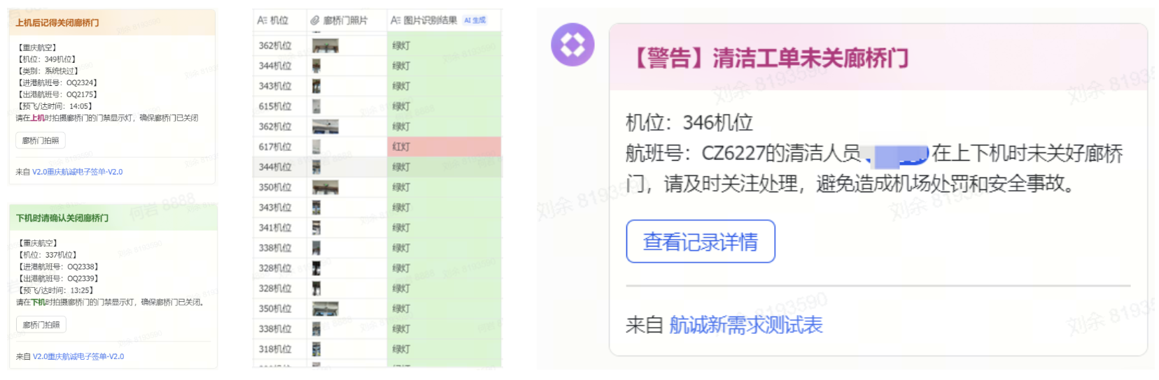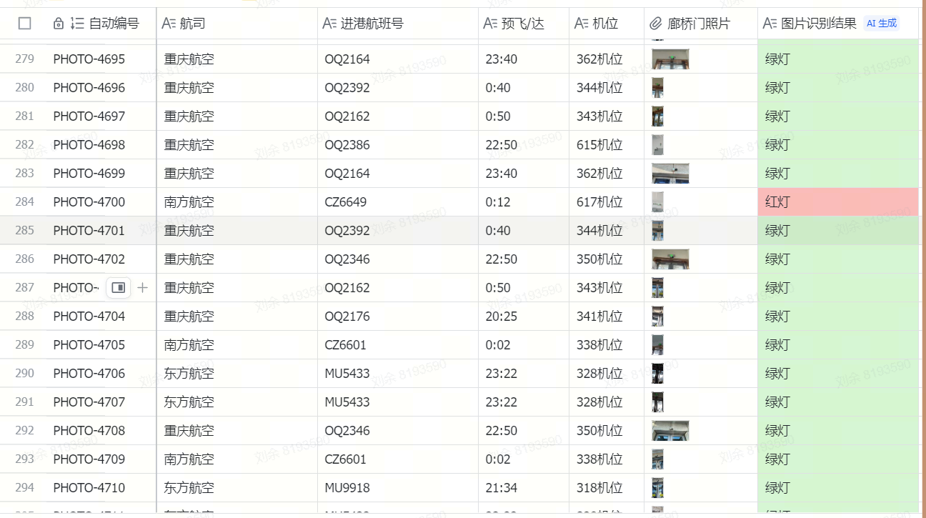 清洁作业人员通过员工通道上下机后,应确保廊桥门处于紧闭状态,避免旅客误闯,保障机场运行安全。清洁作业人员每次通过廊桥门禁后,班组长需按照要求,在多维表格中上传门禁照片。借助AI大模型的图像识别能力,依据门禁灯颜色、门框物理特征判断廊桥门是否紧闭。若发现门禁未紧闭等异常情况,AI将立即触发告警,由安全员进行人工审核确认,及时排除隐患。