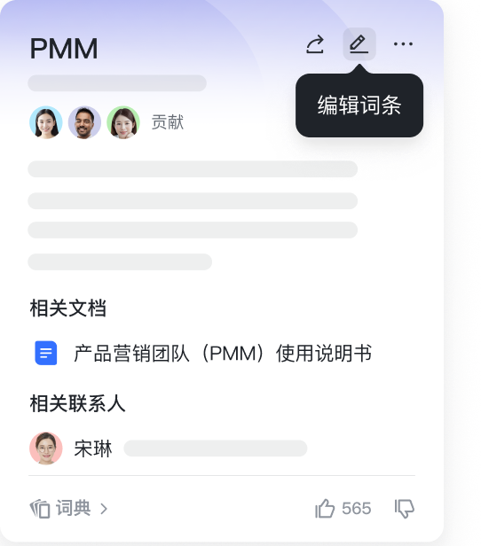 知识消费者,也是贡献者:每位员工都可以查看、创建、更新词典内容,通过点赞和反馈,还可以帮助保持企业知识鲜活。在读写文档时,遇到合适内容、鼠标划词即可快速填充到词条中。