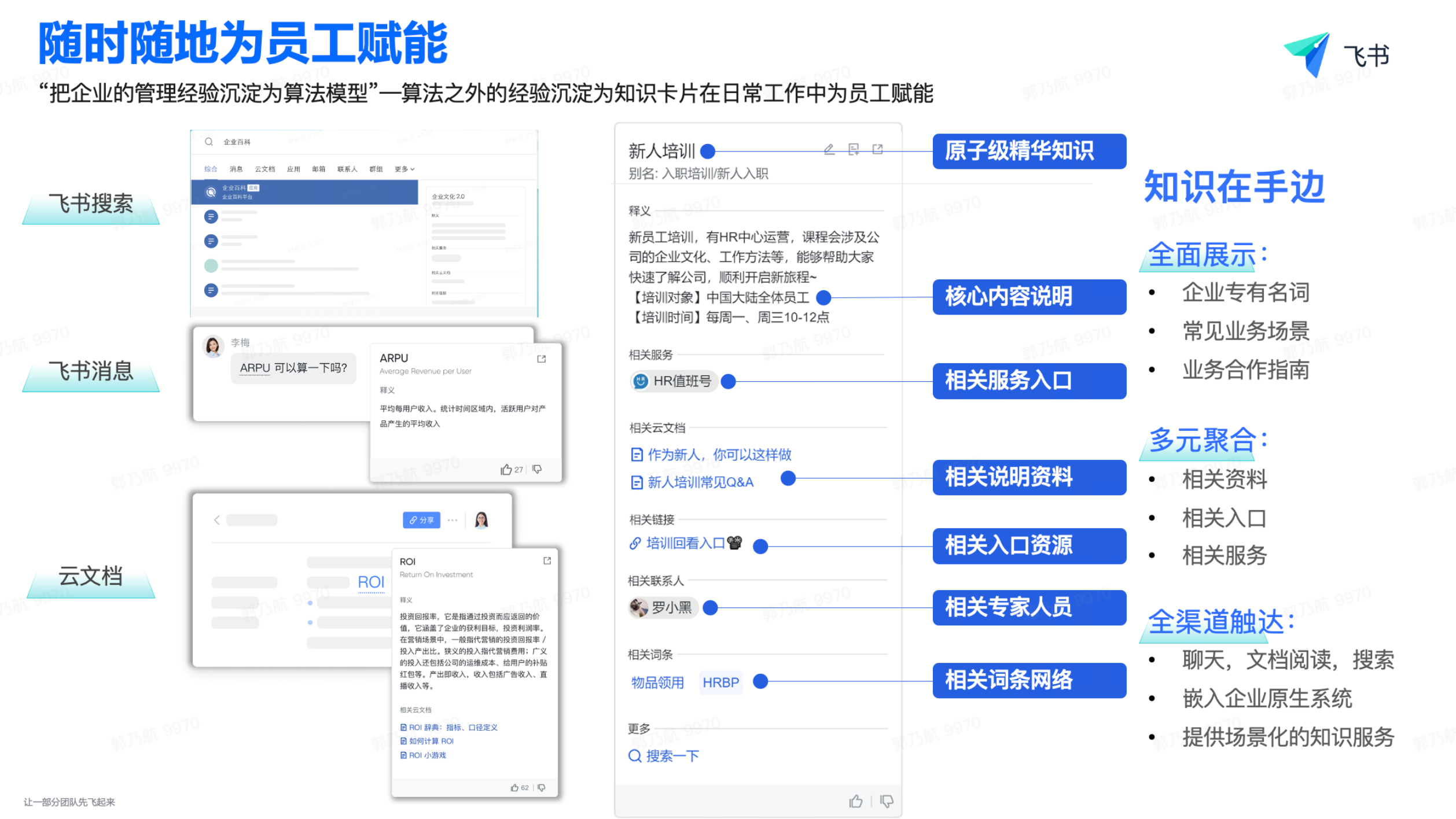 - 企业特色话术:即使在同行业内,每家企业都会有长久发展带来的企业专属词,例如飞书特色开会方式“飞阅会”,这类知识点即使去搜索引擎“搜索一下”也无法得到准确答案,甚至会更加困惑。