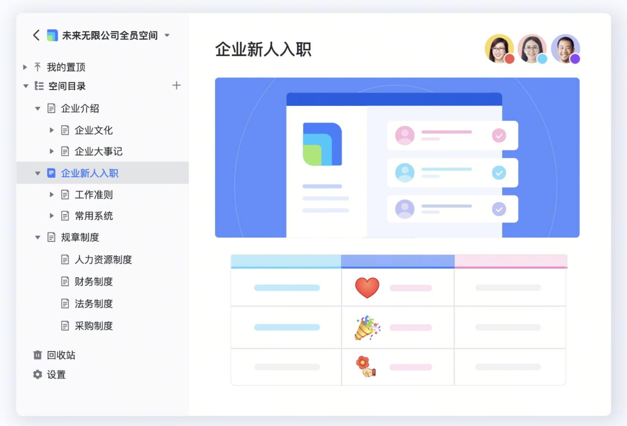 - 开箱即用:模板化最佳实践,管理员可以一键创建项目协作、企业文化、规章制度、产品手册等知识库。