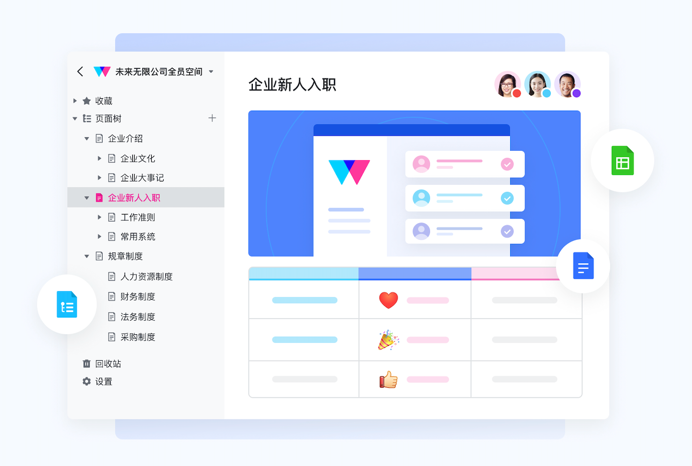 - 知识协同:与飞书套件打通,具备已有在线文档的所有优势;知识在线,且随时保持更新,关注人还可以收到订阅提醒;会议妙享,多人在线围绕 Wiki 文档展开会议;支持快速迁移 Confluence 的内容