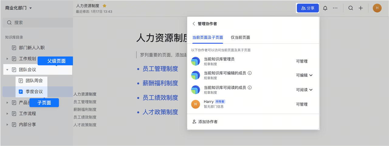 - 权限精细管控:父、子层级的页面分享权限解耦,可按照分享范围扩大和收敛控制权限
