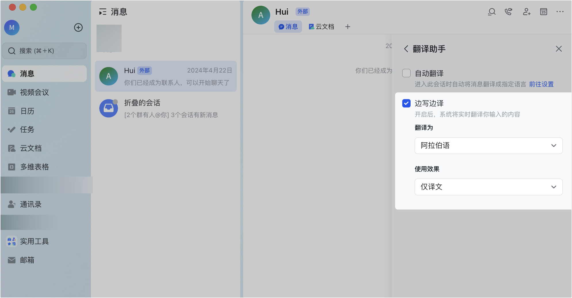 或者进入会话设置中选择“自动翻译”、“边写边译”,差异化设置针对来自不同国家的海外同事母语沟通。