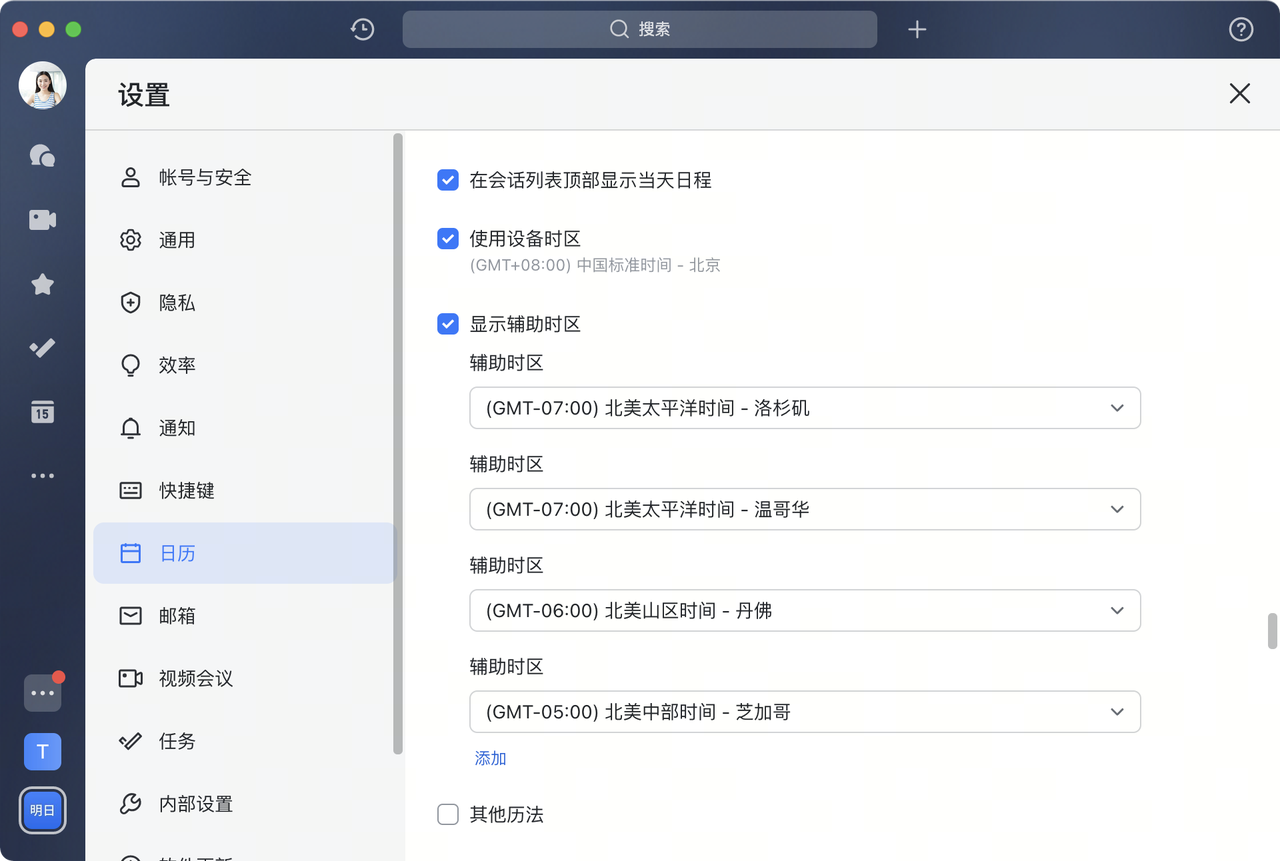 假如在异国出差,还可以更改时区;需要和多国同事同步沟通时,可以在设置页添加多个辅助时区。