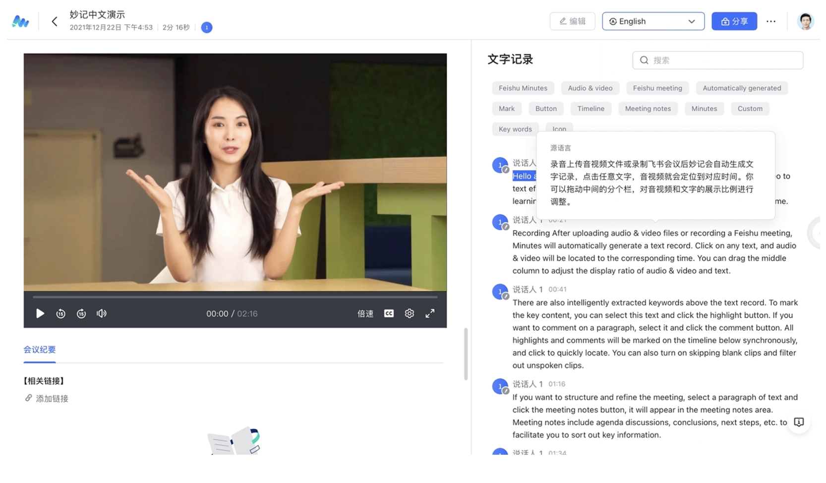 妙记文本内容可识别超 100 种源语言,支持翻译成 24 种目标语言;音频内容(语音消息、会议)可识别 3 种源语言(中、英、日),并翻译成 24 种目标语言,覆盖多场景跨语言沟通需求。