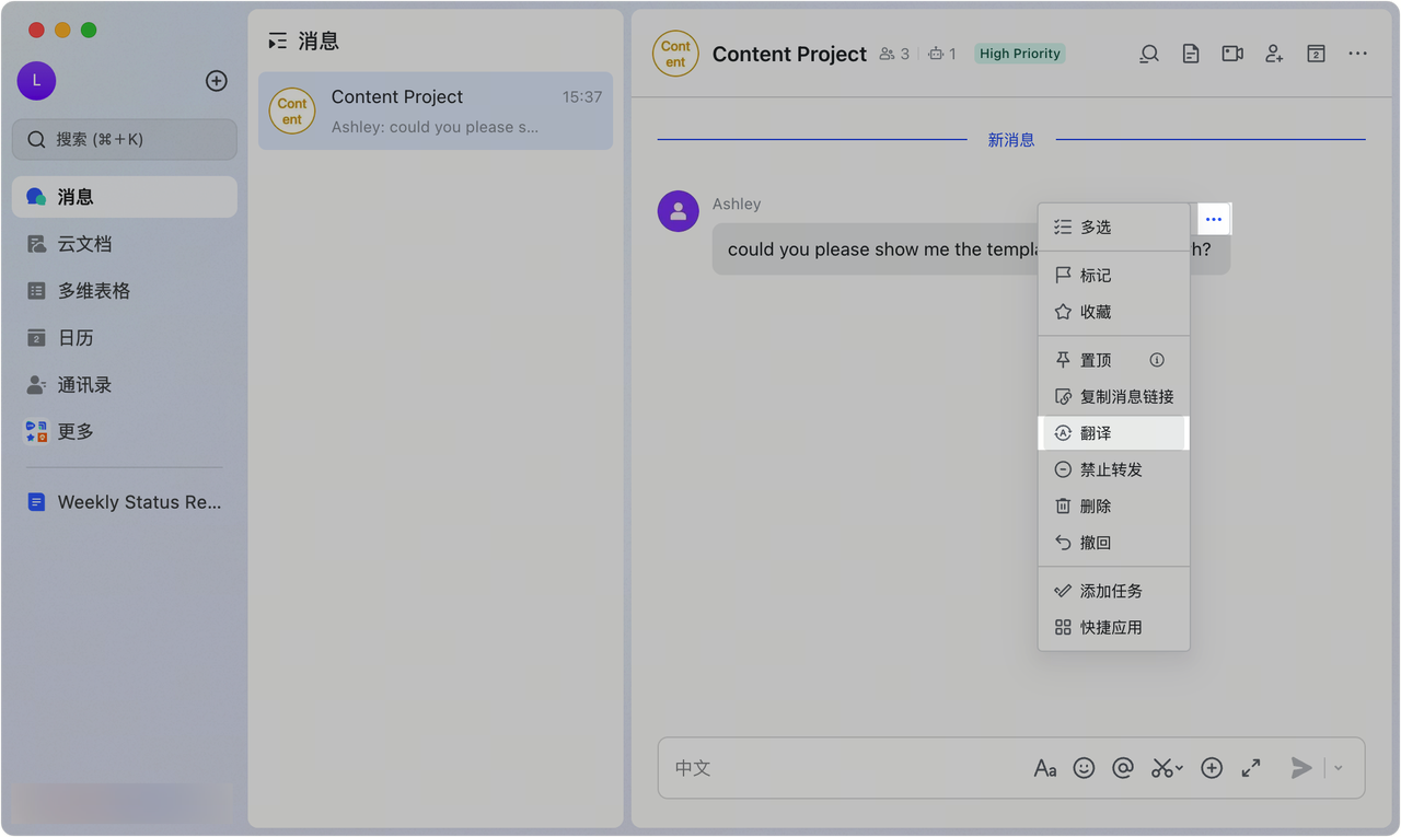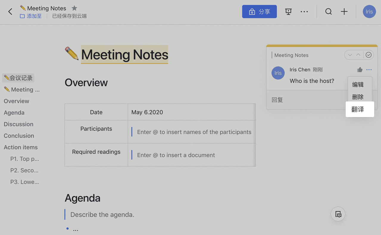 无论是全文、特定段落还是评论,飞书都支持20+语种的翻译。