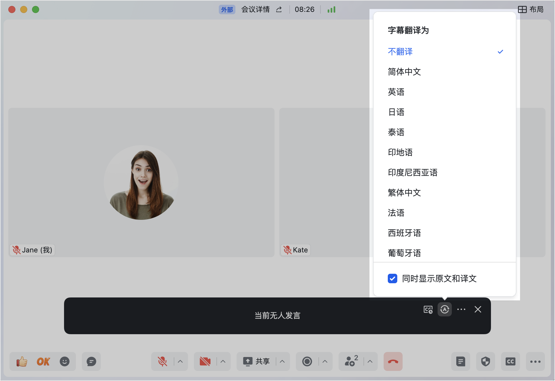 - 多语互译:当参会人员使用中文、英文或日文发言时,字幕支持互译,你还可以选择“同时显示译文和译文”,对照理解更准确。