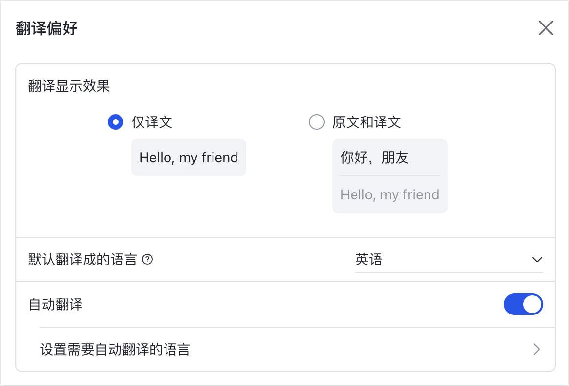 可以选择手动翻译某条特定消息,也可以开启全局自动翻译,甚至设置自主翻译偏好(仅显示译文或译文对照)。