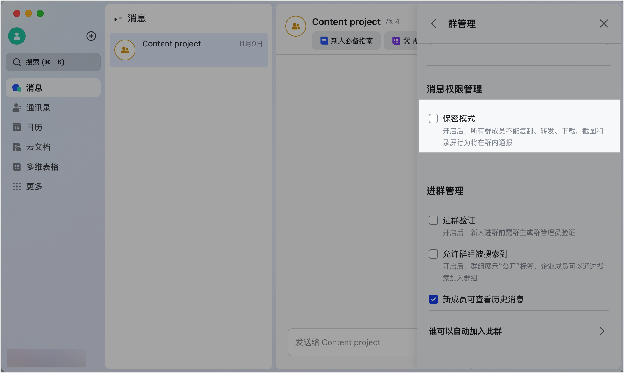 - 群聊保密模式: 开启保密模式后,群主/群管理员可以选择开启以下部分或全部权限: