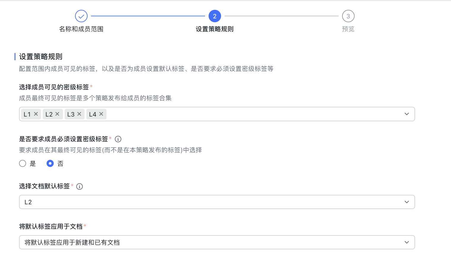密级标签分类 :飞书云文档分为【L4】~【L1】四个密级,对应从高到低的保密级别,逐级提升保护策略。