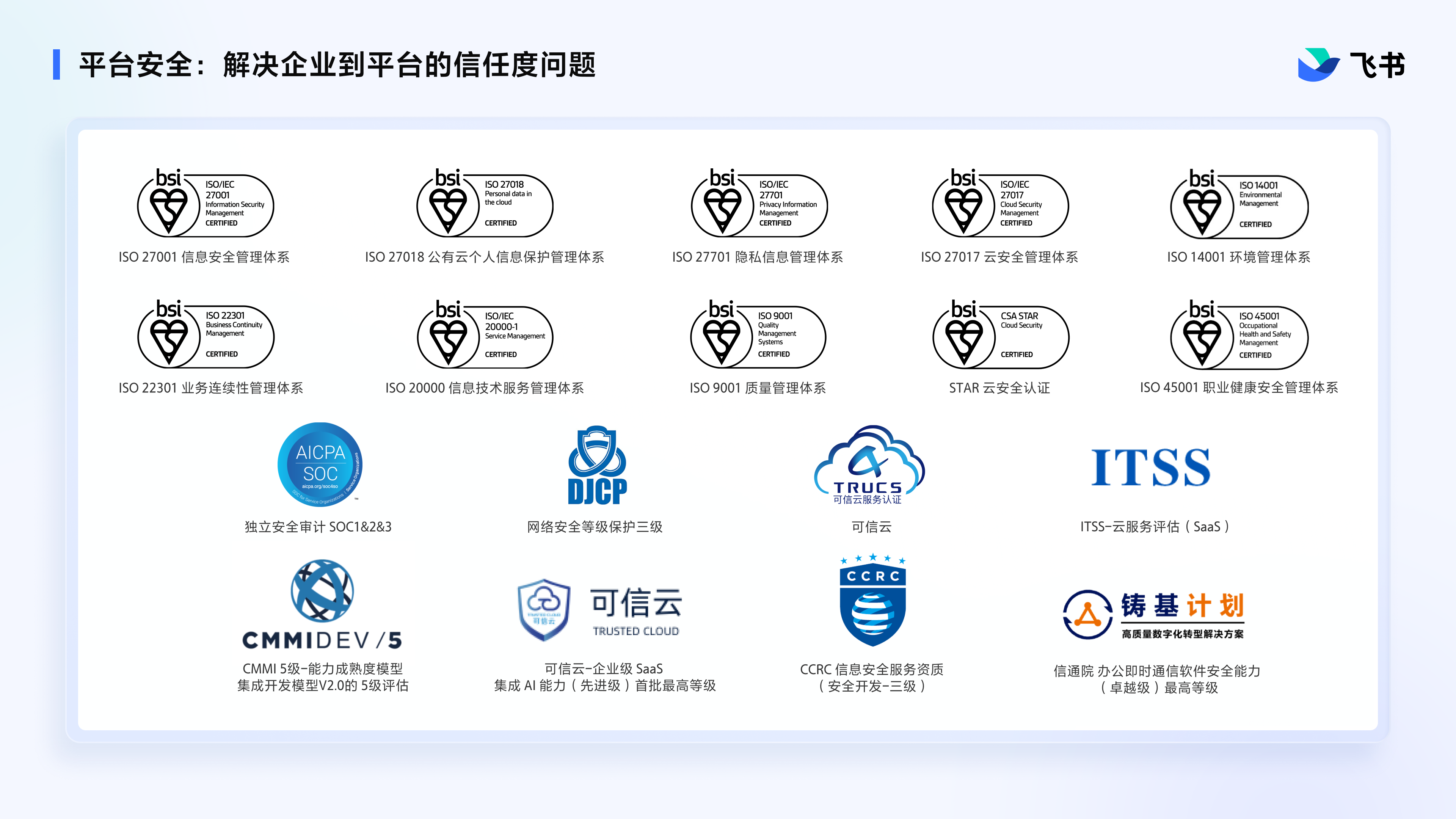 飞书已获得多项安全认证,包括: