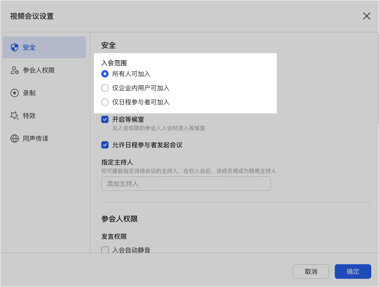 - 入会范围: 主持人可设置仅限企业内用户加入,或仅限日程参与者加入。