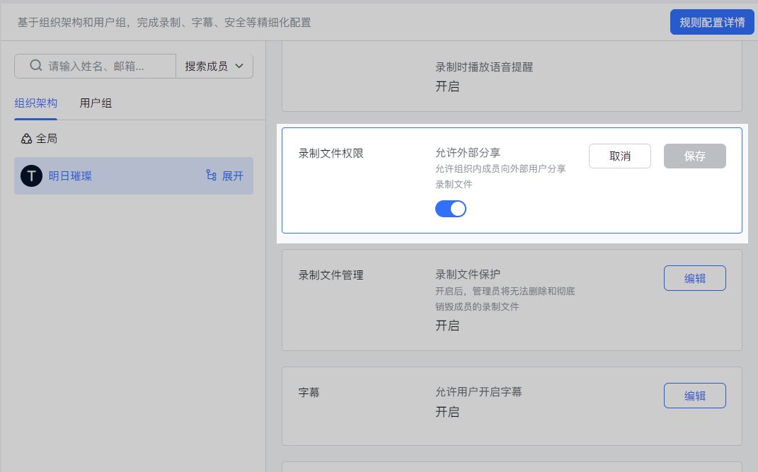 - 录制文件权限: 管理员可全局设置是否允许录制文件(妙记)分享到组织外部