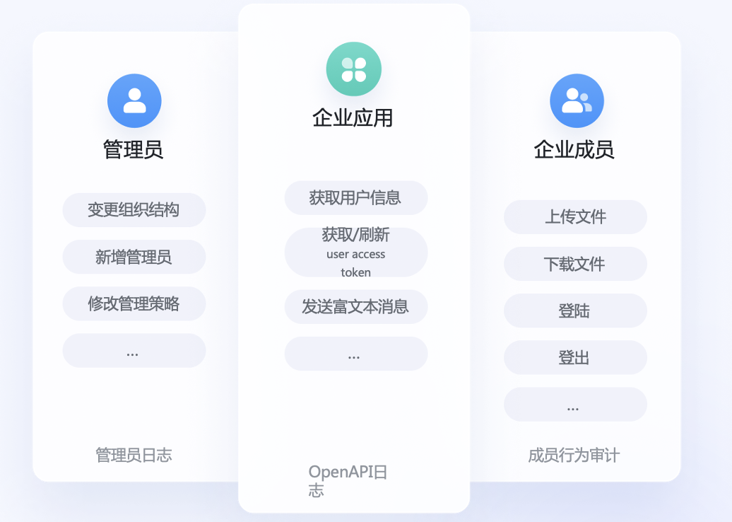 飞书提供完善的日志系统,包括 管理员日志、成员行为审计 以及 OpenAPI日志 。管理员可以灵活配置告警策略,一旦出现异常的数据下载或访问行为,系统能第一时间帮助企业定位风险,追溯责任。